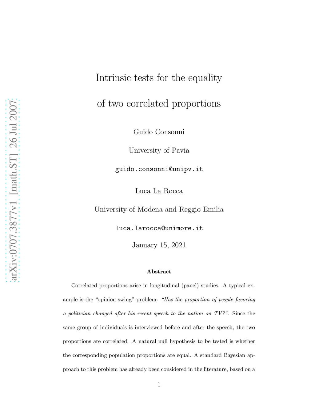 Correlated proportions arise in longitudinal (panel) studies. A typical example is the ``opinion swing'' problem: ``Has the proportion of people favoring a politician changed after his recent speech to the nation on TV?''. Since the same group of individuals is interviewed before and after the speech, the two proportions are correlated. A natural null hypothesis to be tested is whether the corresponding population proportions are equal. A standard Bayesian approach to this problem has already been considered in the literature, based on a Dirichlet prior for the cell-probabilities of the underlying two-by-two table under the alternative hypothesis, together with an induced prior under the null. In lack of specific prior information, a diffuse (e.g. uniform) distribution may be used. We claim that this approach is not satisfactory, since in a testing problem one should make sure that the prior under the alternative be adequately centered around the region specified by the null, in order to obtain a fair comparison between the two hypotheses. Following an intrinsic prior methodology, we develop two strategies for the construction of a collection of objective priors increasingly peaked around the null. We provide a simple interpretation of their structure in terms of weighted imaginary sample scenarios. We illustrate our method by means of three examples, carrying out sensitivity analysis and providing comparison with existing results.