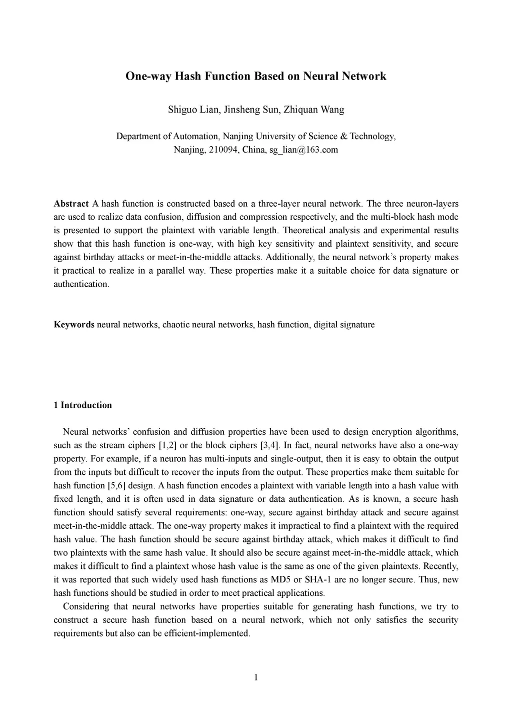 A hash function is constructed based on a three-layer neural network. The three neuron-layers are used to realize data confusion, diffusion and compression respectively, and the multi-block hash mode is presented to support the plaintext with variable length. Theoretical analysis and experimental results show that this hash function is one-way, with high key sensitivity and plaintext sensitivity, and secure against birthday attacks or meet-in-the-middle attacks. Additionally, the neural network's property makes it practical to realize in a parallel way. These properties make it a suitable choice for data signature or authentication.