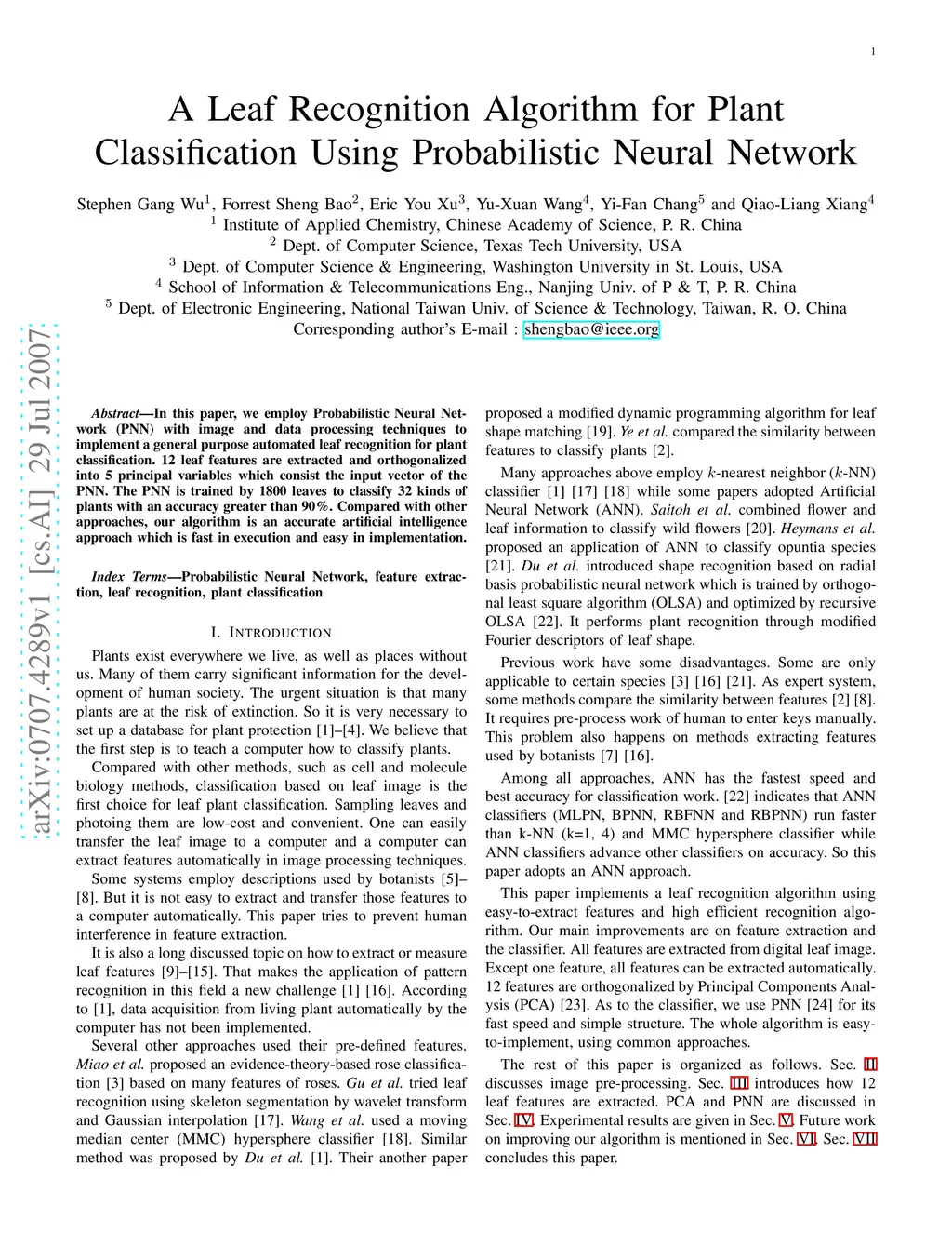 In this paper, we employ Probabilistic Neural Network (PNN) with image and data processing techniques to implement a general purpose automated leaf recognition algorithm. 12 leaf features are extracted and orthogonalized into 5 principal variables which consist the input vector of the PNN. The PNN is trained by 1800 leaves to classify 32 kinds of plants with an accuracy greater than 90%. Compared with other approaches, our algorithm is an accurate artificial intelligence approach which is fast in execution and easy in implementation.
