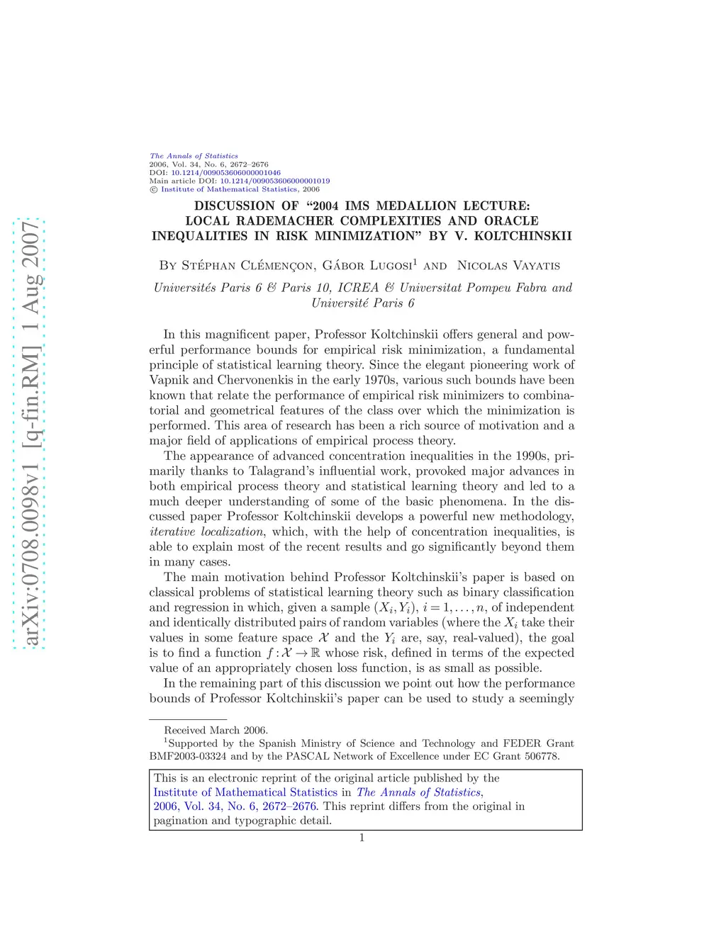 Discussion of ``2004 IMS Medallion Lecture: Local Rademacher complexities and oracle inequalities in risk minimization'' by V. Koltchinskii [arXiv:0708.0083]