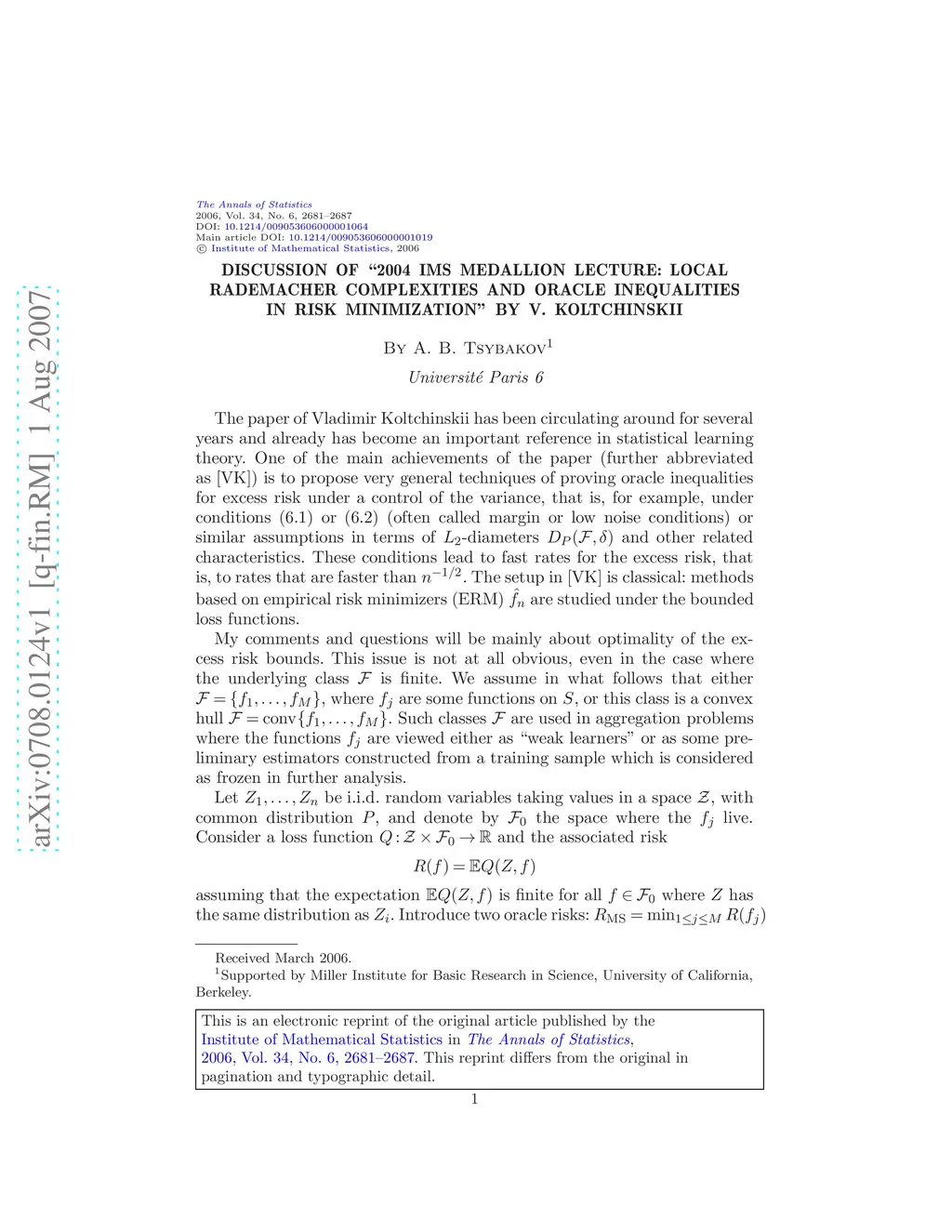 Discussion of ``2004 IMS Medallion Lecture: Local Rademacher complexities and oracle inequalities in risk minimization'' by V. Koltchinskii [arXiv:0708.0083]