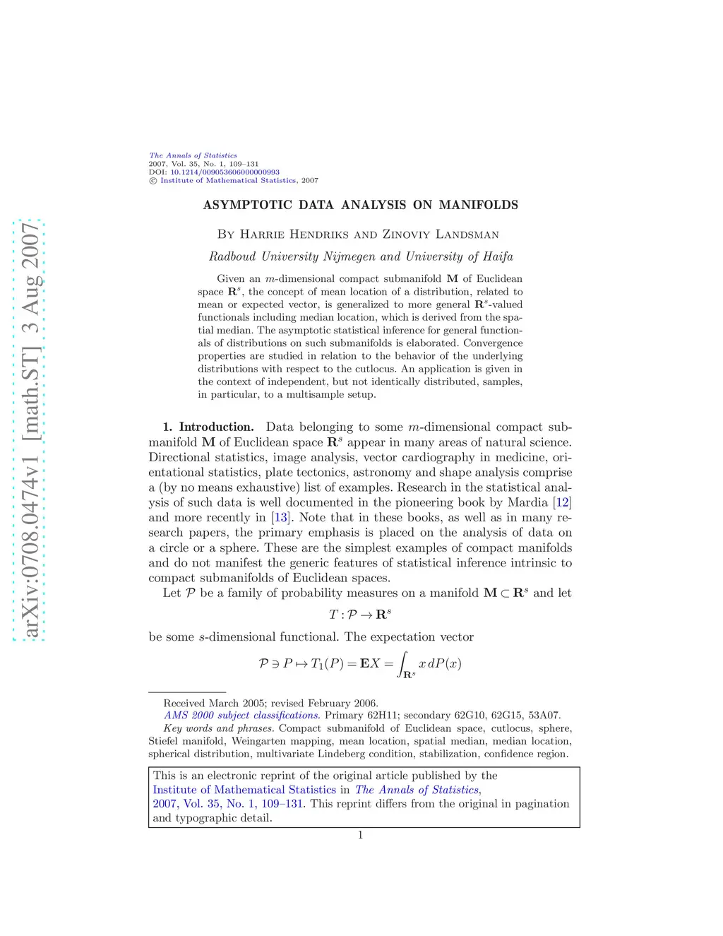 Given an m-dimensional compact submanifold of Euclidean space , the concept of mean location of a distribution, related to mean or expected vector, is generalized to more general -valued functionals including median location, which is derived from the spatial median. The asymptotic statistical inference for general functionals of distributions on such submanifolds is elaborated. Convergence properties are studied in relation to the behavior of the underlying distributions with respect to the cutlocus. An application is given in the context of independent, but not identically distributed, samples, in particular, to a multisample setup.