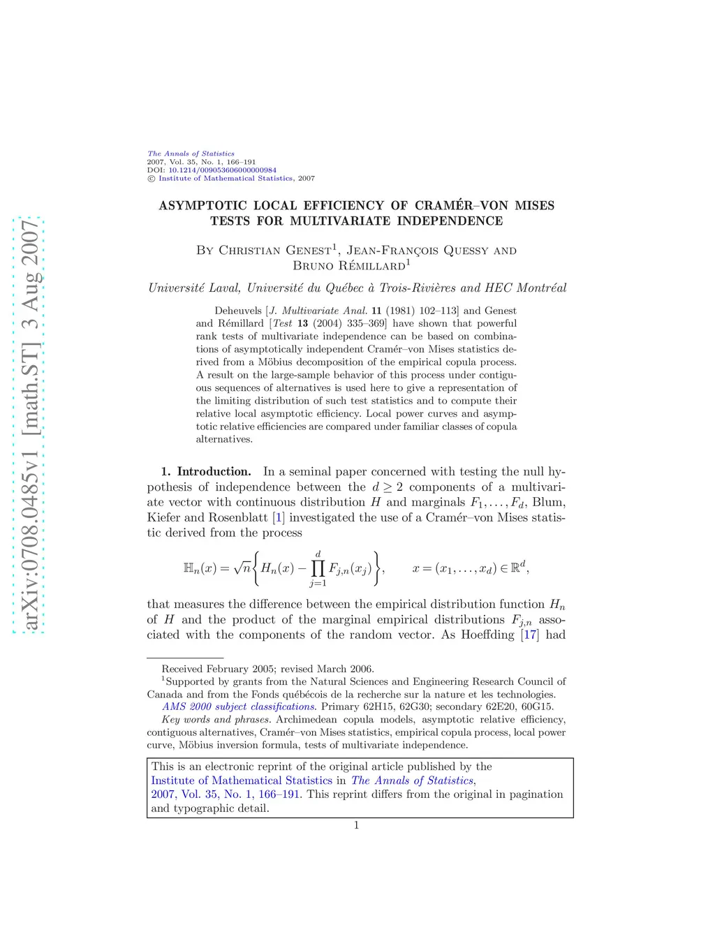 Deheuvels [J. Multivariate Anal. 11 (1981) 102--113] and Genest and R\'{e}millard [Test 13 (2004) 335--369] have shown that powerful rank tests of multivariate independence can be based on combinations of asymptotically independent Cram\'{e}r--von Mises statistics derived from a M\"{o}bius decomposition of the empirical copula process. A result on the large-sample behavior of this process under contiguous sequences of alternatives is used here to give a representation of the limiting distribution of such test statistics and to compute their relative local asymptotic efficiency. Local power curves and asymptotic relative efficiencies are compared under familiar classes of copula alternatives.