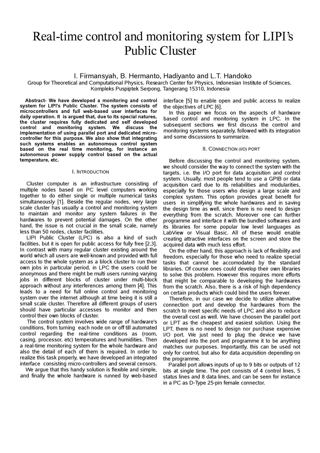 We have developed a monitoring and control system for LIPI's Public Cluster. The system consists of microcontrollers and full web-based user interfaces for daily operation. It is argued that, due to its special natures, the cluster requires fully dedicated and self developed control and monitoring system. We discuss the implementation of using parallel port and dedicated micro-controller for this purpose. We also show that integrating such systems enables an autonomous control system based on the real time monitoring, for instance an autonomous power supply control based on the actual temperature, etc.