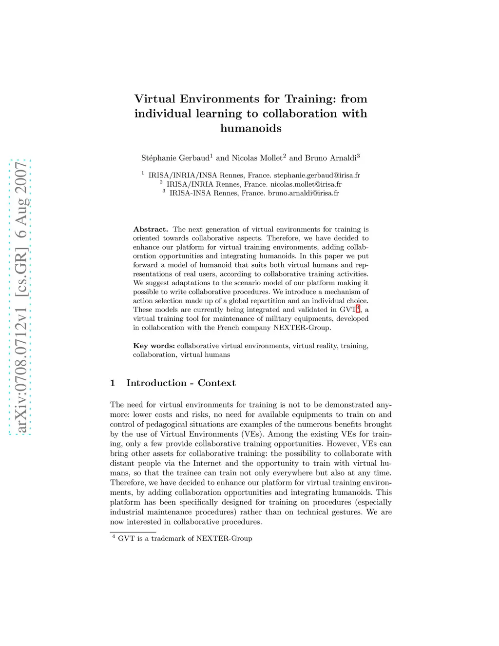 The next generation of virtual environments for training is oriented towards collaborative aspects. Therefore, we have decided to enhance our platform for virtual training environments, adding collaboration opportunities and integrating humanoids. In this paper we put forward a model of humanoid that suits both virtual humans and representations of real users, according to collaborative training activities. We suggest adaptations to the scenario model of our platform making it possible to write collaborative procedures. We introduce a mechanism of action selection made up of a global repartition and an individual choice. These models are currently being integrated and validated in GVT, a virtual training tool for maintenance of military equipments, developed in collaboration with the French company NEXTER-Group.