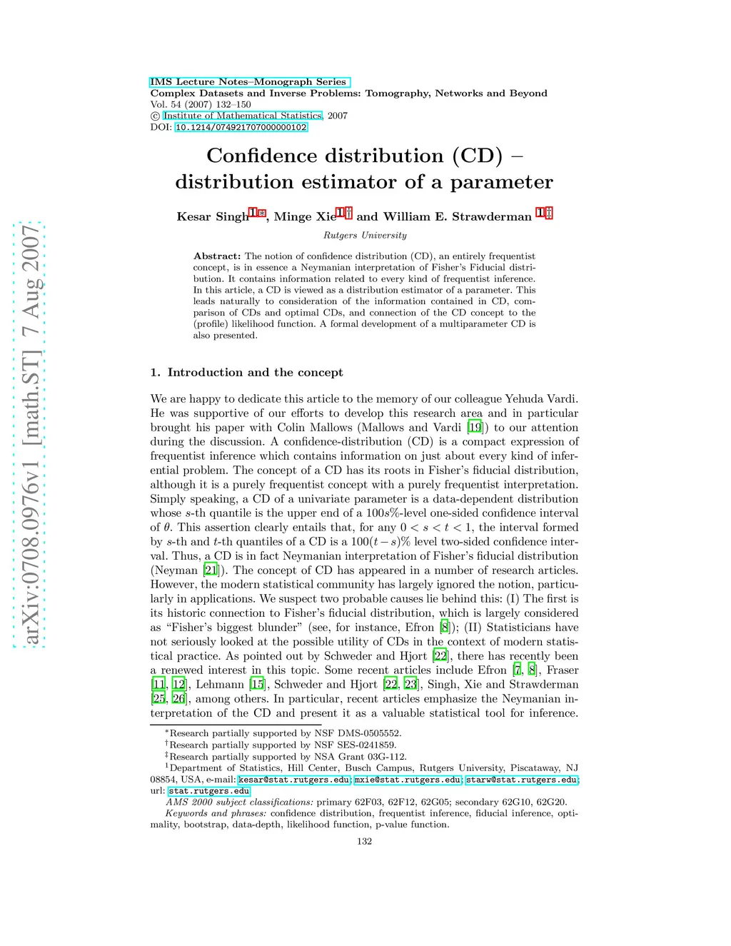 Confidence distribution (CD) -- distribution estimator of a parameter