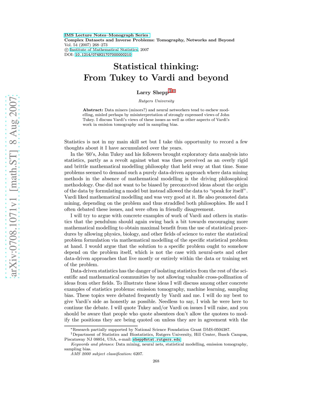 Data miners (minors?) and neural networkers tend to eschew modelling, misled perhaps by misinterpretation of strongly expressed views of John Tukey. I discuss Vardi's views of these issues as well as other aspects of Vardi's work in emision tomography and in sampling bias.