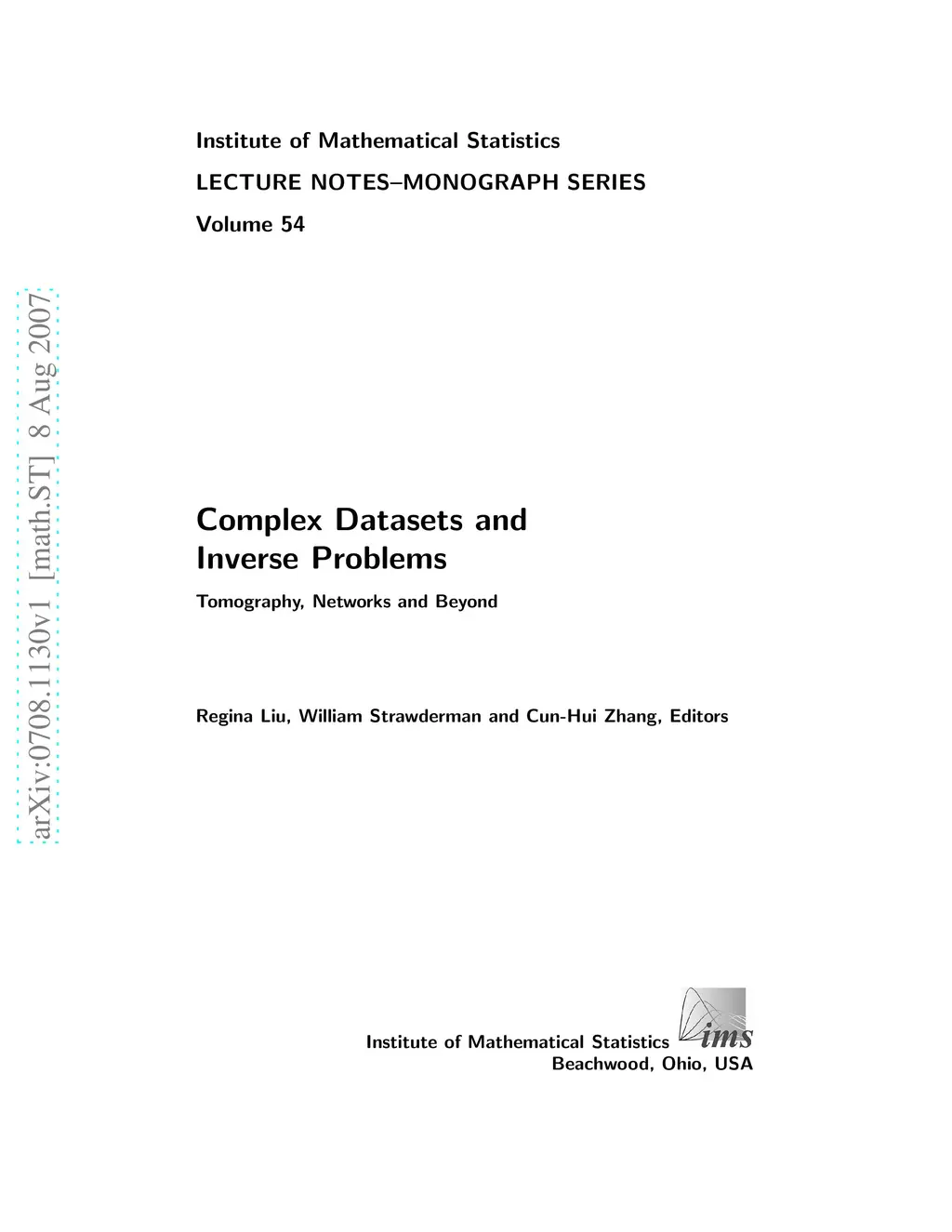 This book is a collection of papers dedicated to the memory of Yehuda Vardi. Yehuda was the chair of the Department of Statistics of Rutgers University when he passed away unexpectedly on January 13, 2005. On October 21--22, 2005, some 150 leading scholars from many different fields, including statistics, telecommunications, biomedical engineering, bioinformatics, biostatistics and epidemiology, gathered at Rutgers in a conference in his honor. This conference was on ``Complex Datasets and Inverse Problems: Tomography, Networks, and Beyond,'' and was organized by the editors. The present collection includes research work presented at the conference, as well as contributions from Yehuda's colleagues. The theme of the conference was networks and other important and emerging areas of research involving incomplete data and statistical inverse problems. Networks are abundant around us: communication, computer, traffic, social and energy are just a few examples. As enormous amounts of network data are collected in this information age, the field has attracted a great amount of attention from researchers in statistics and computer engineering as well as telecommunication providers and various government agencies. However, few statistical tools have been developed for analyzing network data as they are typically governed by time-varying and mutually dependent communication protocols sitting on complicated graph-structured network topologies. Many prototypical applications in these and other important technologies can be viewed as statistical inverse problems with complex, massive, high-dimensional and possibly biased/incomplete data. This unifying theme of inverse problems is particularly appropriate for a conference and volume dedicated to the memory of Yehuda. Indeed he made influential contributions to these fields, especially in medical tomography, biased data, statistical inverse problems, and network tomography.