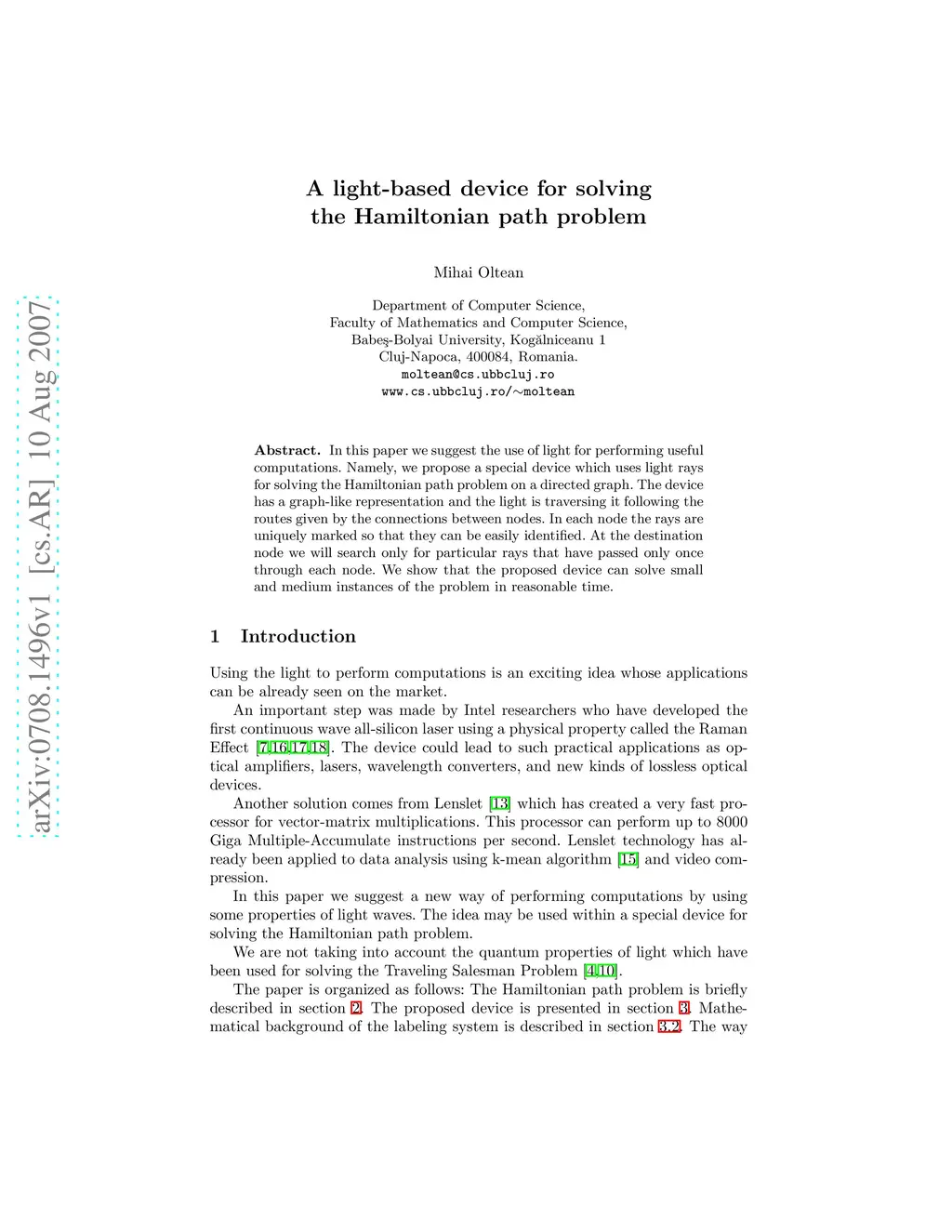 In this paper we suggest the use of light for performing useful computations. Namely, we propose a special device which uses light rays for solving the Hamiltonian path problem on a directed graph. The device has a graph-like representation and the light is traversing it following the routes given by the connections between nodes. In each node the rays are uniquely marked so that they can be easily identified. At the destination node we will search only for particular rays that have passed only once through each node. We show that the proposed device can solve small and medium instances of the problem in reasonable time.