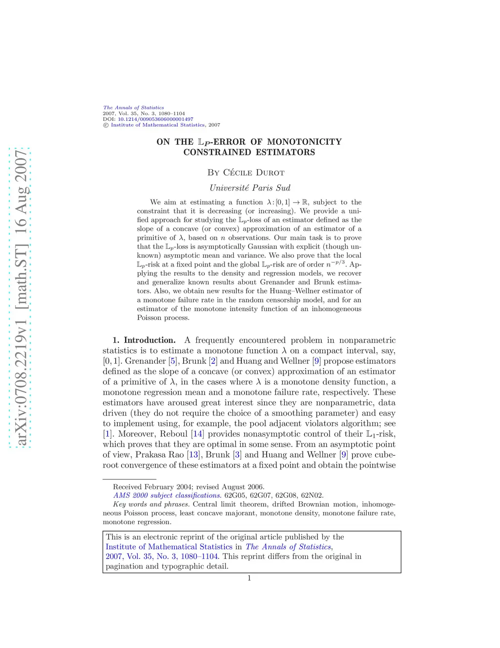 We aim at estimating a function , subject to the constraint that it is decreasing (or increasing). We provide a unified approach for studying the -loss of an estimator defined as the slope of a concave (or convex) approximation of an estimator of a primitive of , based on observations. Our main task is to prove that the -loss is asymptotically Gaussian with explicit (though unknown) asymptotic mean and variance. We also prove that the local -risk at a fixed point and the global -risk are of order . Applying the results to the density and regression models, we recover and generalize known results about Grenander and Brunk estimators. Also, we obtain new results for the Huang--Wellner estimator of a monotone failure rate in the random censorship model, and for an estimator of the monotone intensity function of an inhomogeneous Poisson process.