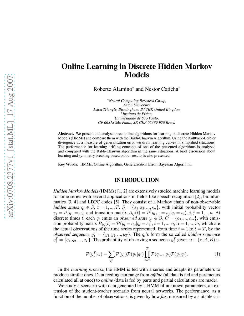 We present and analyse three online algorithms for learning in discrete Hidden Markov Models (HMMs) and compare them with the Baldi-Chauvin Algorithm. Using the Kullback-Leibler divergence as a measure of generalisation error we draw learning curves in simplified situations. The performance for learning drifting concepts of one of the presented algorithms is analysed and compared with the Baldi-Chauvin algorithm in the same situations. A brief discussion about learning and symmetry breaking based on our results is also presented.