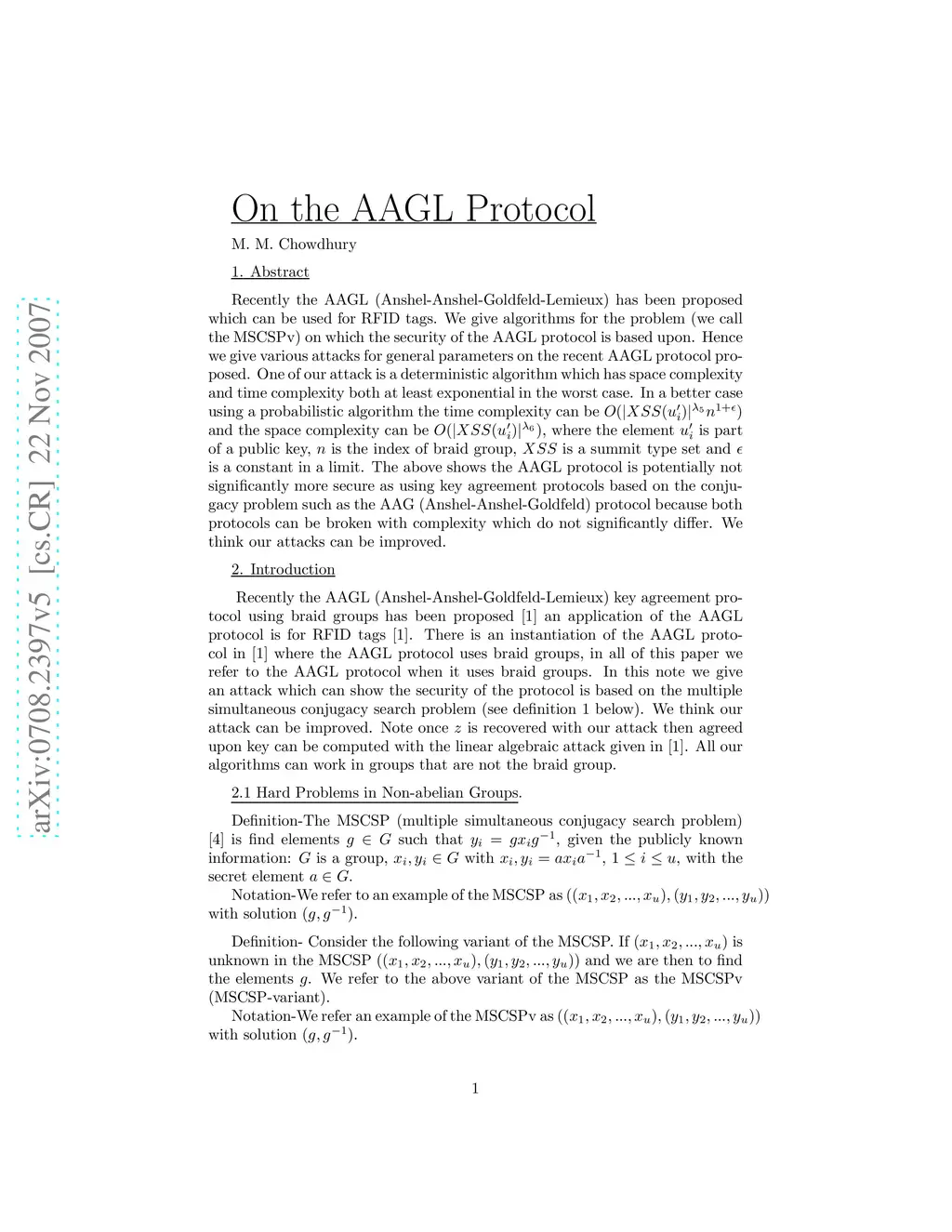 Recently the AAGL (Anshel-Anshel-Goldfeld-Lemieux) has been proposed which can be used for RFID tags. We give algorithms for the problem (we call the MSCSPv) on which the security of the AAGL protocol is based upon. Hence we give various attacks for general parameters on the recent AAGL protocol proposed. One of our attacks is a deterministic algorithm which has space complexity and time complexity both atleast exponentialin the worst case. In a better case using a probabilistic algorithm the time complexity canbe O(|XSS(ui')^L5*(n^(1+e)) and the space complexity can be O(|XSS(ui')|^L6), where the element ui' is part of a public key, n is the index of braid group, XSS is a summit type set and e is a constant in a limit. The above shows the AAGL protocol is potentially not significantly more secure as using key agreement protocols based on the conjugacy problem such as the AAG (Anshel-Anshel-Goldfeld) protocol because both protocols can be broken with complexity which do not significantly differ. We think our attacks can be improved.