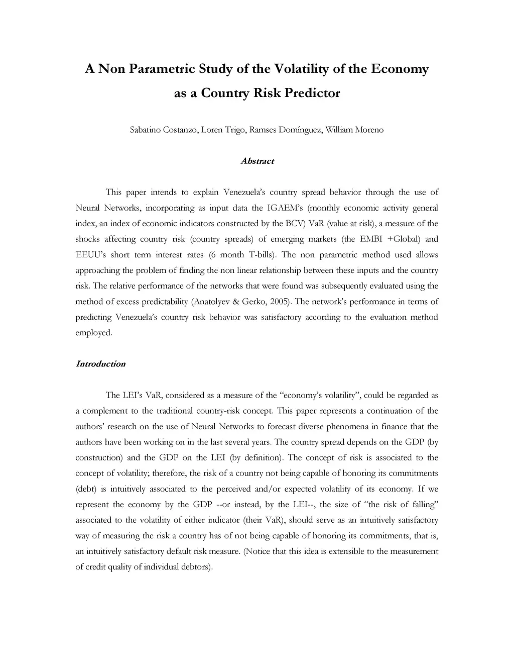 This paper intends to explain Venezuela's country spread behavior through the Neural Networks analysis of a monthly economic activity general index of economic indicators constructed by the Central Bank of Venezuela, a measure of the shocks affecting country risk of emerging markets and the U.S. short term interest rate. The use of non parametric methods allowed the finding of non linear relationship between these inputs and the country risk. The networks performance was evaluated using the method of excess predictability.