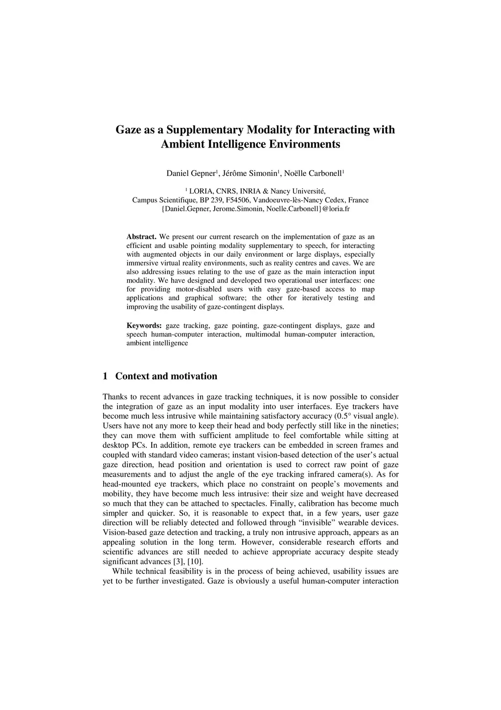 We present our current research on the implementation of gaze as an efficient and usable pointing modality supplementary to speech, for interacting with augmented objects in our daily environment or large displays, especially immersive virtual reality environments, such as reality centres and caves. We are also addressing issues relating to the use of gaze as the main interaction input modality. We have designed and developed two operational user interfaces: one for providing motor-disabled users with easy gaze-based access to map applications and graphical software; the other for iteratively testing and improving the usability of gaze-contingent displays.