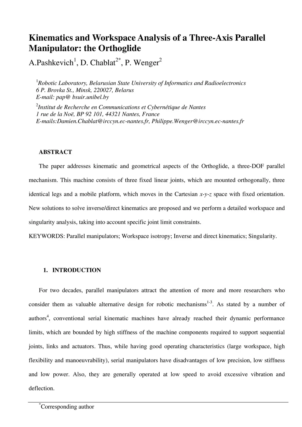 The paper addresses kinematic and geometrical aspects of the Orthoglide, a three-DOF parallel mechanism. This machine consists of three fixed linear joints, which are mounted orthogonally, three identical legs and a mobile platform, which moves in the Cartesian x-y-z space with fixed orientation. New solutions to solve inverse/direct kinematics are proposed and we perform a detailed workspace and singularity analysis, taking into account specific joint limit constraints.