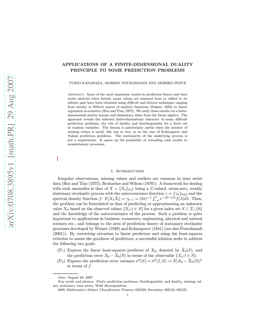 Some of the most important results in prediction theory and time series analysis when finitely many values are removed from or added to its infinite past have been obtained using difficult and diverse techniques ranging from duality in Hilbert spaces of analytic functions (Nakazi, 1984) to linear regression in statistics (Box and Tiao, 1975). We unify these results via a finite-dimensional duality lemma and elementary ideas from the linear algebra. The approach reveals the inherent finite-dimensional character of many difficult prediction problems, the role of duality and biorthogonality for a finite set of random variables. The lemma is particularly useful when the number of missing values is small, like one or two, as in the case of Kolmogorov and Nakazi prediction problems. The stationarity of the underlying process is not a requirement. It opens up the possibility of extending such results to nonstationary processes.