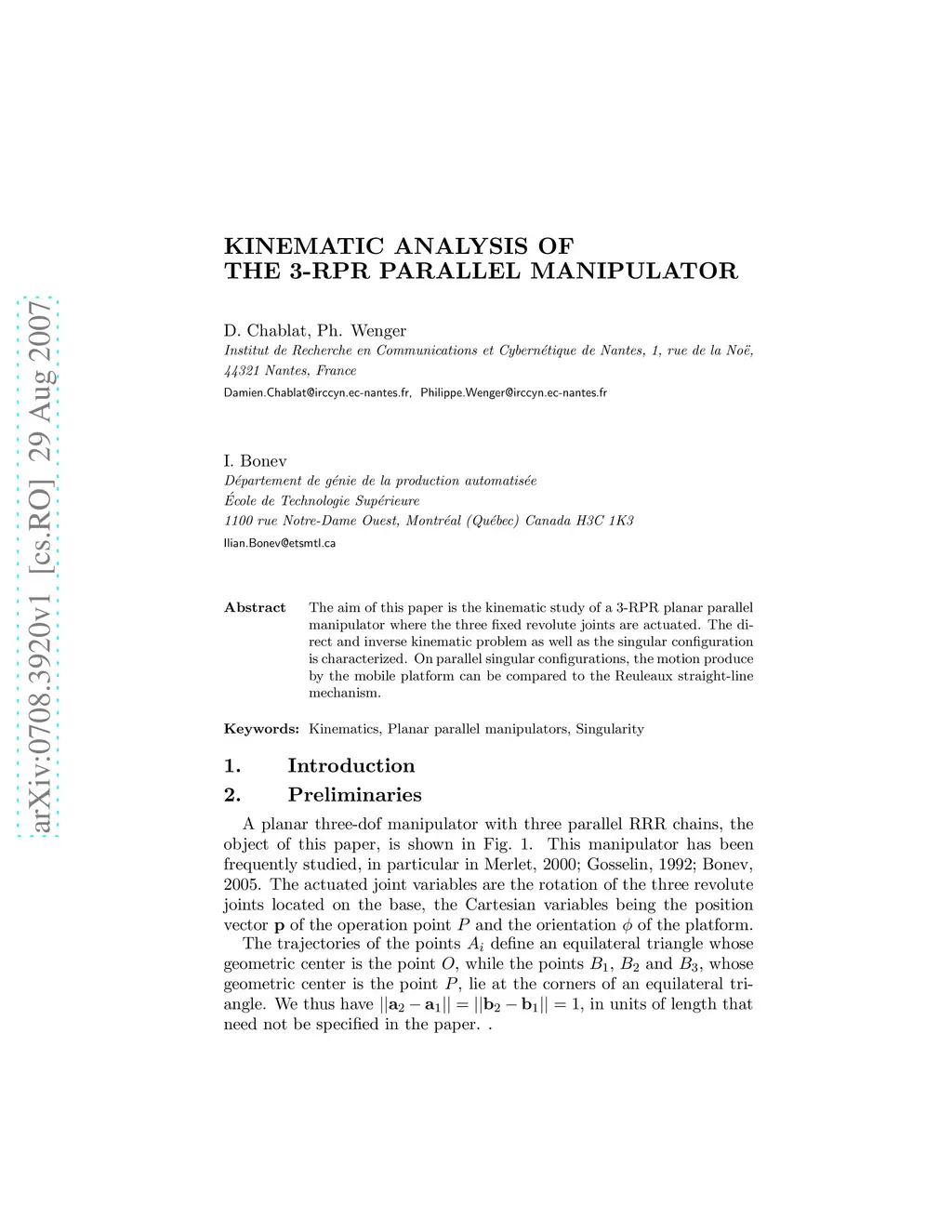 The aim of this paper is the kinematic study of a 3-RPR planar parallel manipulator where the three fixed revolute joints are actuated. The direct and inverse kinematic problem as well as the singular configuration is characterized. On parallel singular configurations, the motion produce by the mobile platform can be compared to the Reuleaux straight-line mechanism.