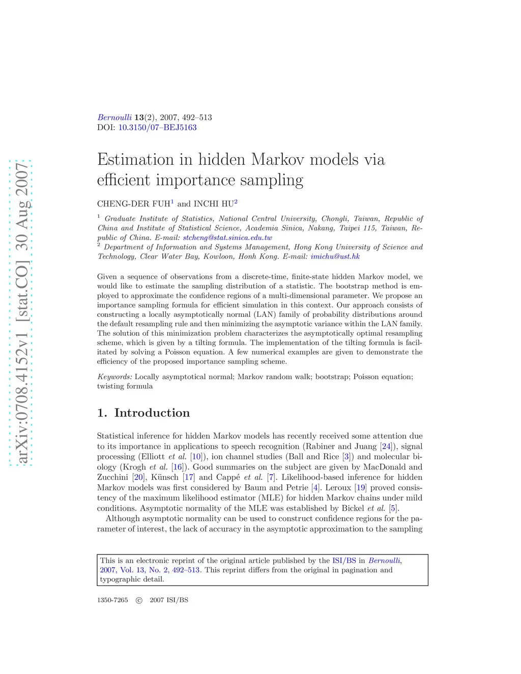 Given a sequence of observations from a discrete-time, finite-state hidden Markov model, we would like to estimate the sampling distribution of a statistic. The bootstrap method is employed to approximate the confidence regions of a multi-dimensional parameter. We propose an importance sampling formula for efficient simulation in this context. Our approach consists of constructing a locally asymptotically normal (LAN) family of probability distributions around the default resampling rule and then minimizing the asymptotic variance within the LAN family. The solution of this minimization problem characterizes the asymptotically optimal resampling scheme, which is given by a tilting formula. The implementation of the tilting formula is facilitated by solving a Poisson equation. A few numerical examples are given to demonstrate the efficiency of the proposed importance sampling scheme.