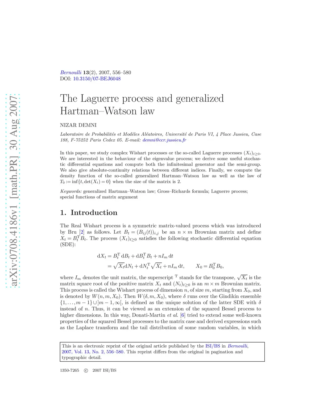 The Laguerre process and generalized Hartman--Watson law