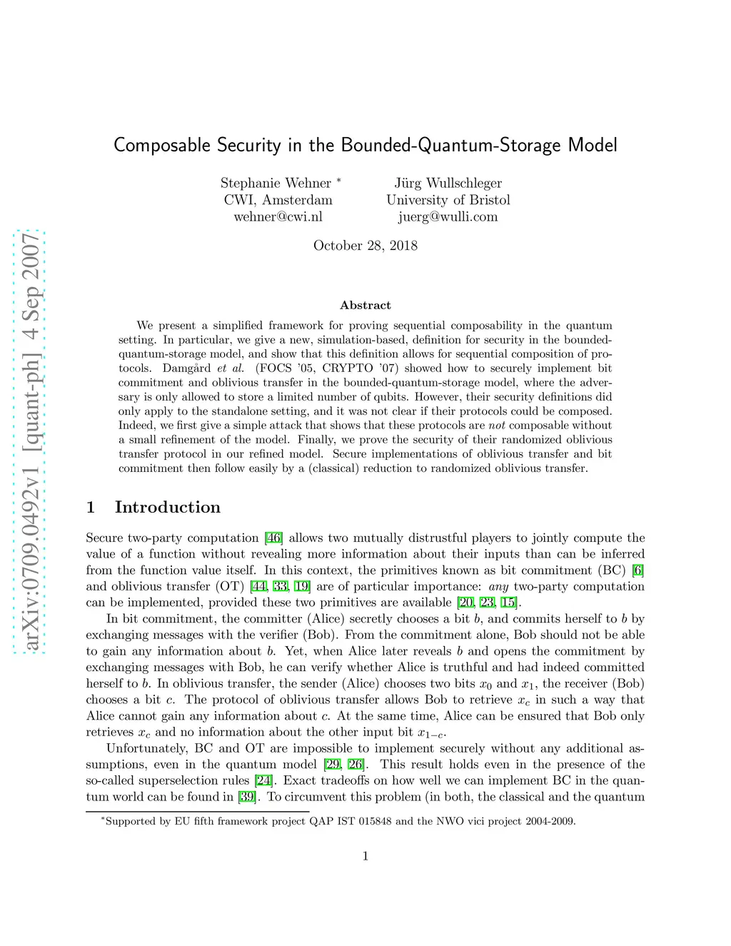We present a simplified framework for proving sequential composability in the quantum setting. In particular, we give a new, simulation-based, definition for security in the bounded-quantum-storage model, and show that this definition allows for sequential composition of protocols. Damgard et al. (FOCS '05, CRYPTO '07) showed how to securely implement bit commitment and oblivious transfer in the bounded-quantum-storage model, where the adversary is only allowed to store a limited number of qubits. However, their security definitions did only apply to the standalone setting, and it was not clear if their protocols could be composed. Indeed, we first give a simple attack that shows that these protocols are not composable without a small refinement of the model. Finally, we prove the security of their randomized oblivious transfer protocol in our refined model. Secure implementations of oblivious transfer and bit commitment then follow easily by a (classical) reduction to randomized oblivious transfer.