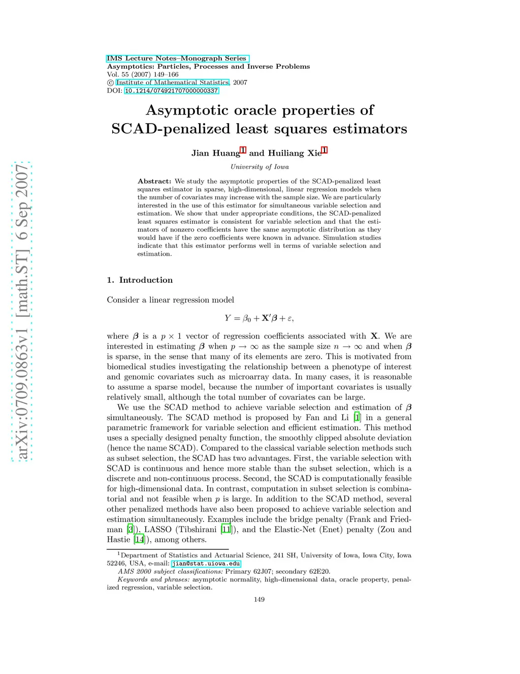 Asymptotic oracle properties of SCAD-penalized least squares estimators