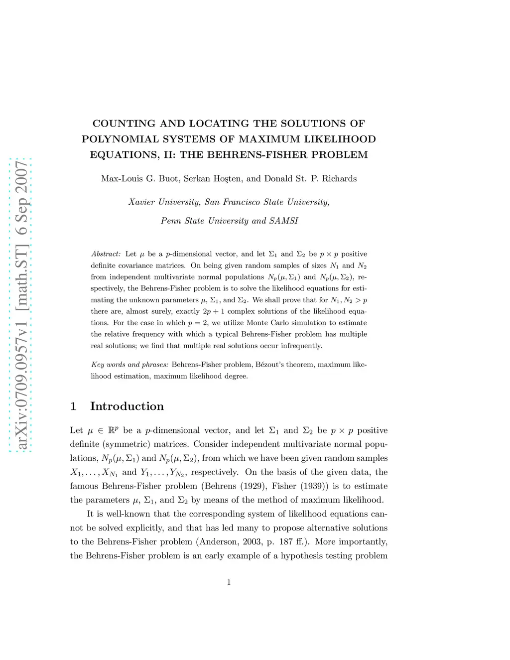 Let be a -dimensional vector, and let and be positive definite covariance matrices. On being given random samples of sizes and from independent multivariate normal populations and , respectively, the Behrens-Fisher problem is to solve the likelihood equations for estimating the unknown parameters , , and . We shall prove that for there are, almost surely, exactly complex solutions of the likelihood equations. For the case in which , we utilize Monte Carlo simulation to estimate the relative frequency with which a typical Behrens-Fisher problem has multiple real solutions; we find that multiple real solutions occur infrequently.