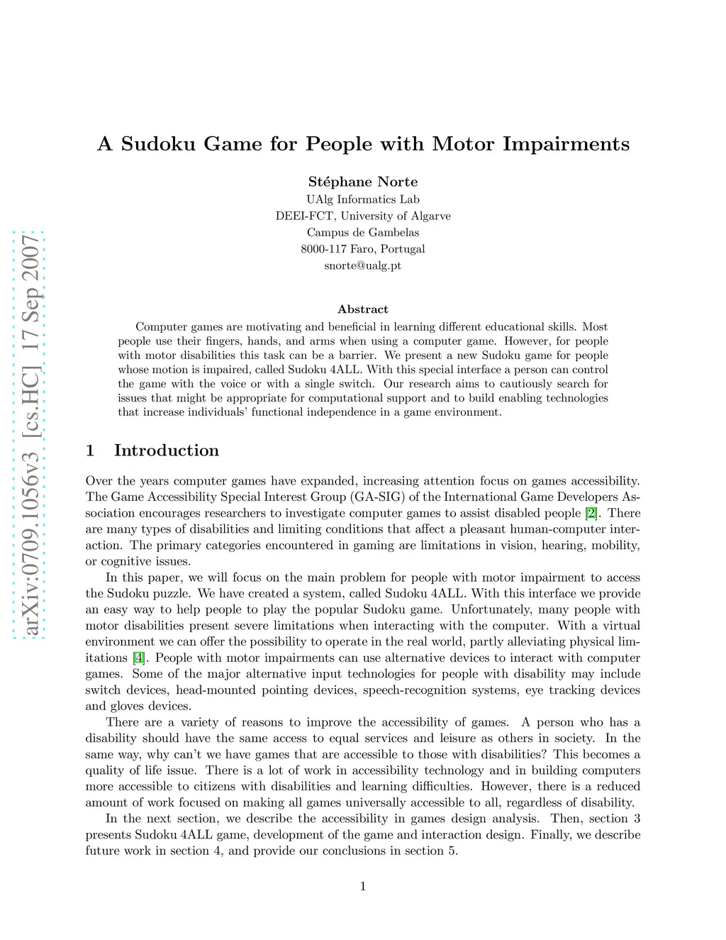 Computer games are motivating and beneficial in learning different educational skills. Most people use their fingers, hands, and arms when using a computer game. However, for people with motor disabilities this task can be a barrier. We present a new Sudoku game for people whose motion is impaired, called Sudoku 4ALL. With this special interface a person can control the game with the voice or with a single switch. Our research aims to cautiously search for issues that might be appropriate for computational support and to build enabling technologies that increase individuals' functional independence in a game environment.
