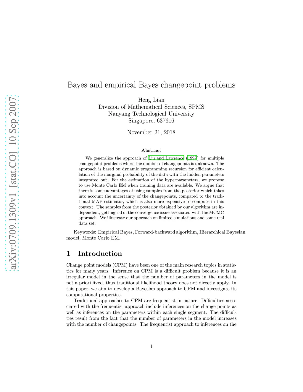 We generalize the approach of Liu and Lawrence (1999) for multiple changepoint problems where the number of changepoints is unknown. The approach is based on dynamic programming recursion for efficient calculation of the marginal probability of the data with the hidden parameters integrated out. For the estimation of the hyperparameters, we propose to use Monte Carlo EM when training data are available. We argue that there is some advantages of using samples from the posterior which takes into account the uncertainty of the changepoints, compared to the traditional MAP estimator, which is also more expensive to compute in this context. The samples from the posterior obtained by our algorithm are independent, getting rid of the convergence issue associated with the MCMC approach. We illustrate our approach on limited simulations and some real data set.