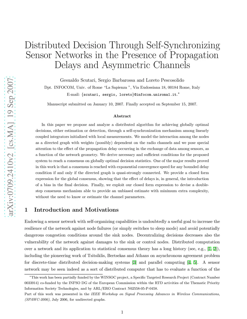 In this paper we propose and analyze a distributed algorithm for achieving globally optimal decisions, either estimation or detection, through a self-synchronization mechanism among linearly coupled integrators initialized with local measurements. We model the interaction among the nodes as a directed graph with weights (possibly) dependent on the radio channels and we pose special attention to the effect of the propagation delay occurring in the exchange of data among sensors, as a function of the network geometry. We derive necessary and sufficient conditions for the proposed system to reach a consensus on globally optimal decision statistics. One of the major results proved in this work is that a consensus is reached with exponential convergence speed for any bounded delay condition if and only if the directed graph is quasi-strongly connected. We provide a closed form expression for the global consensus, showing that the effect of delays is, in general, the introduction of a bias in the final decision. Finally, we exploit our closed form expression to devise a double-step consensus mechanism able to provide an unbiased estimate with minimum extra complexity, without the need to know or estimate the channel parameters.