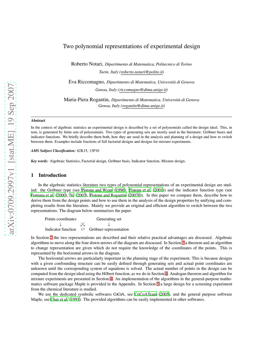 In the context of algebraic statistics an experimental design is described by a set of polynomials called the design ideal. This, in turn, is generated by finite sets of polynomials. Two types of generating sets are mostly used in the literature: Groebner bases and indicator functions. We briefly describe them both, how they are used in the analysis and planning of a design and how to switch between them. Examples include fractions of full factorial designs and designs for mixture experiments.