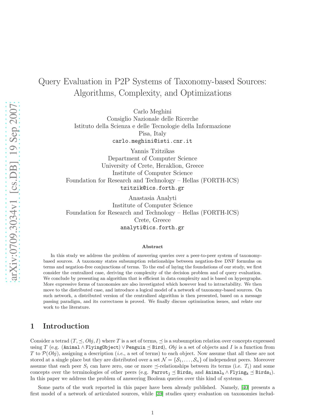 In this study, we address the problem of answering queries over a peer-to-peer system of taxonomy-based sources. A taxonomy states subsumption relationships between negation-free DNF formulas on terms and negation-free conjunctions of terms. To the end of laying the foundations of our study, we first consider the centralized case, deriving the complexity of the decision problem and of query evaluation. We conclude by presenting an algorithm that is efficient in data complexity and is based on hypergraphs. More expressive forms of taxonomies are also investigated, which however lead to intractability. We then move to the distributed case, and introduce a logical model of a network of taxonomy-based sources. On such network, a distributed version of the centralized algorithm is then presented, based on a message passing paradigm, and its correctness is proved. We finally discuss optimization issues, and relate our work to the literature.