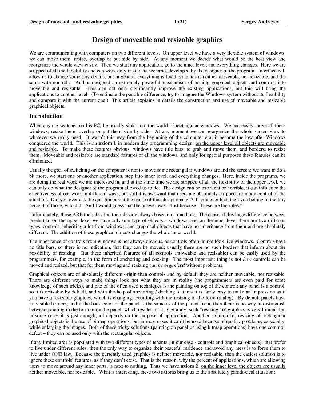 We are communicating with computers on two different levels. On upper level we have a very flexible system of windows: we can move them, resize, overlap or put side by side. At any moment we decide what would be the best view and reorganize the whole view easily. Then we start any application, go to the inner level, and everything changes. Here we are stripped of all the flexibility and can work only inside the scenario, developed by the designer of the program. Interface will allow us to change some tiny details, but in general everything is fixed: graphics is neither moveable, nor resizable, and the same with controls. Author designed an extremely powerful mechanism of turning graphical objects and controls into moveable and resizable. This can not only significantly improve the existing applications, but this will bring the applications to another level. (To estimate the possible difference, try to imagine the Windows system without its flexibility and compare it with the current one.) This article explains in details the construction and use of moveable and resizable graphical objects.