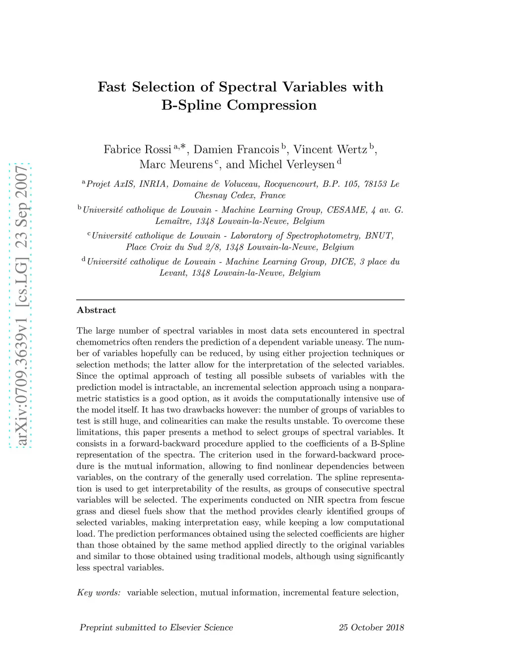 The large number of spectral variables in most data sets encountered in spectral chemometrics often renders the prediction of a dependent variable uneasy. The number of variables hopefully can be reduced, by using either projection techniques or selection methods; the latter allow for the interpretation of the selected variables. Since the optimal approach of testing all possible subsets of variables with the prediction model is intractable, an incremental selection approach using a nonparametric statistics is a good option, as it avoids the computationally intensive use of the model itself. It has two drawbacks however: the number of groups of variables to test is still huge, and colinearities can make the results unstable. To overcome these limitations, this paper presents a method to select groups of spectral variables. It consists in a forward-backward procedure applied to the coefficients of a B-Spline representation of the spectra. The criterion used in the forward-backward procedure is the mutual information, allowing to find nonlinear dependencies between variables, on the contrary of the generally used correlation. The spline representation is used to get interpretability of the results, as groups of consecutive spectral variables will be selected. The experiments conducted on NIR spectra from fescue grass and diesel fuels show that the method provides clearly identified groups of selected variables, making interpretation easy, while keeping a low computational load. The prediction performances obtained using the selected coefficients are higher than those obtained by the same method applied directly to the original variables and similar to those obtained using traditional models, although using significantly less spectral variables.