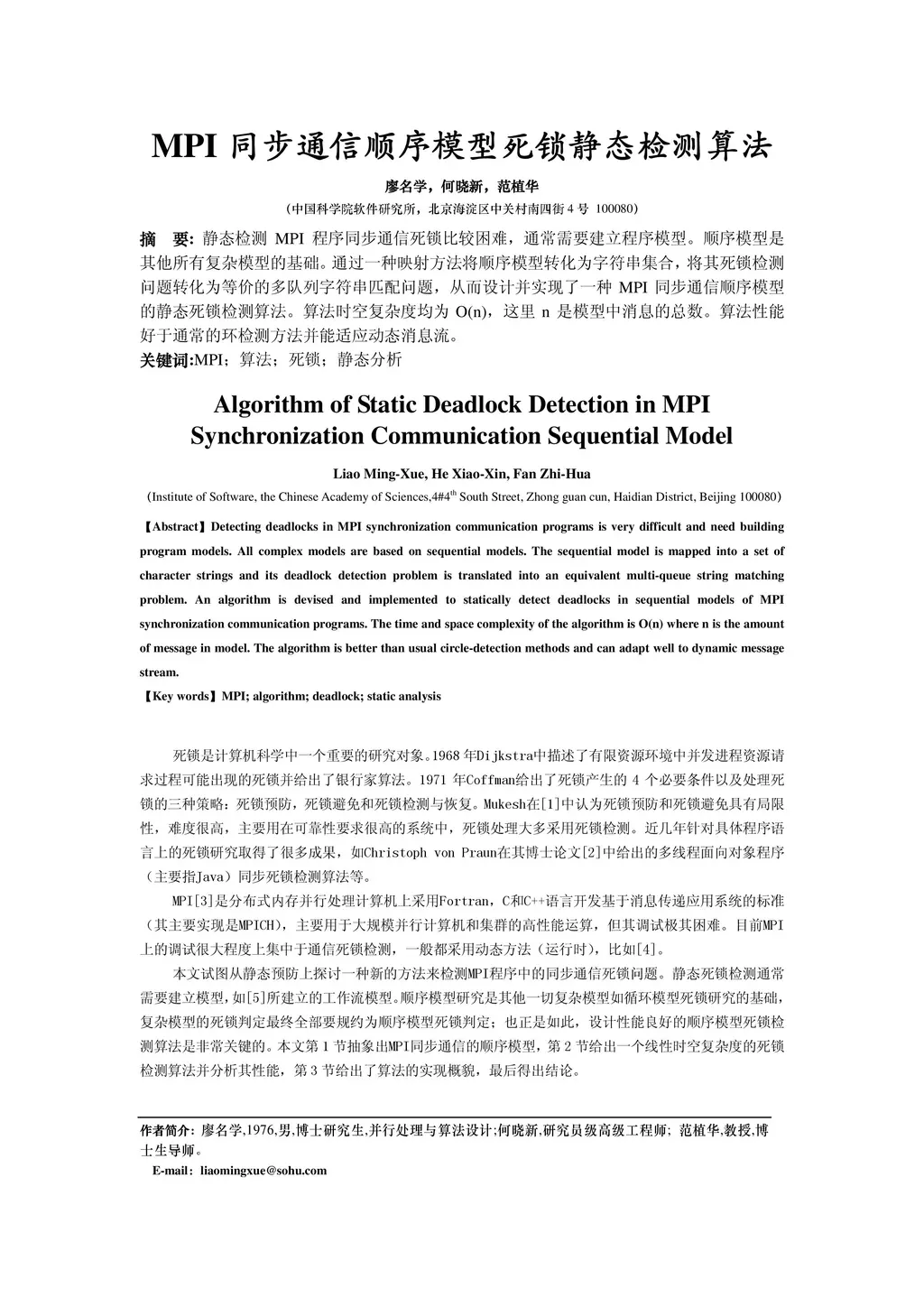 Detecting deadlocks in MPI synchronization communication programs is very difficult and need building program models. All complex models are based on sequential models. The sequential model is mapped into a set of character strings and its deadlock detection problem is translated into an equivalent multi-queue string matching problem. An algorithm is devised and implemented to statically detect deadlocks in sequential models of MPI synchronization communication programs. The time and space complexity of the algorithm is O(n) where n is the amount of message in model. The algorithm is better than usual circle-detection methods and can adapt well to dynamic message stream.