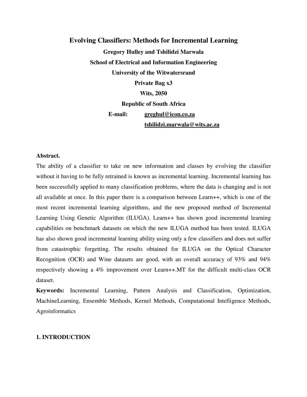The ability of a classifier to take on new information and classes by evolving the classifier without it having to be fully retrained is known as incremental learning. Incremental learning has been successfully applied to many classification problems, where the data is changing and is not all available at once. In this paper there is a comparison between Learn++, which is one of the most recent incremental learning algorithms, and the new proposed method of Incremental Learning Using Genetic Algorithm (ILUGA). Learn++ has shown good incremental learning capabilities on benchmark datasets on which the new ILUGA method has been tested. ILUGA has also shown good incremental learning ability using only a few classifiers and does not suffer from catastrophic forgetting. The results obtained for ILUGA on the Optical Character Recognition (OCR) and Wine datasets are good, with an overall accuracy of 93% and 94% respectively showing a 4% improvement over Learn++.MT for the difficult multi-class OCR dataset.