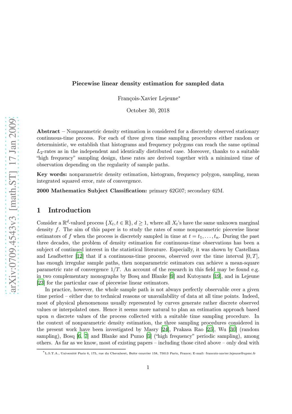 Nonparametric density estimation is considered for a discretely observed stationary continuous-time process. For each of three given time sampling procedures either random or deterministic, we establish that histograms and frequency polygons can reach the same optimal -rates as in the independent and identically distributed case. Moreover, thanks to a suitable "high frequency" sampling design, these rates are derived together with a minimized time of observation depending on the regularity of sample paths.