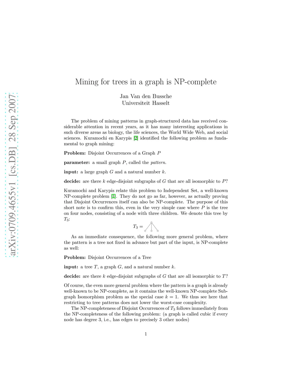 Mining for trees in a graph is shown to be NP-complete.