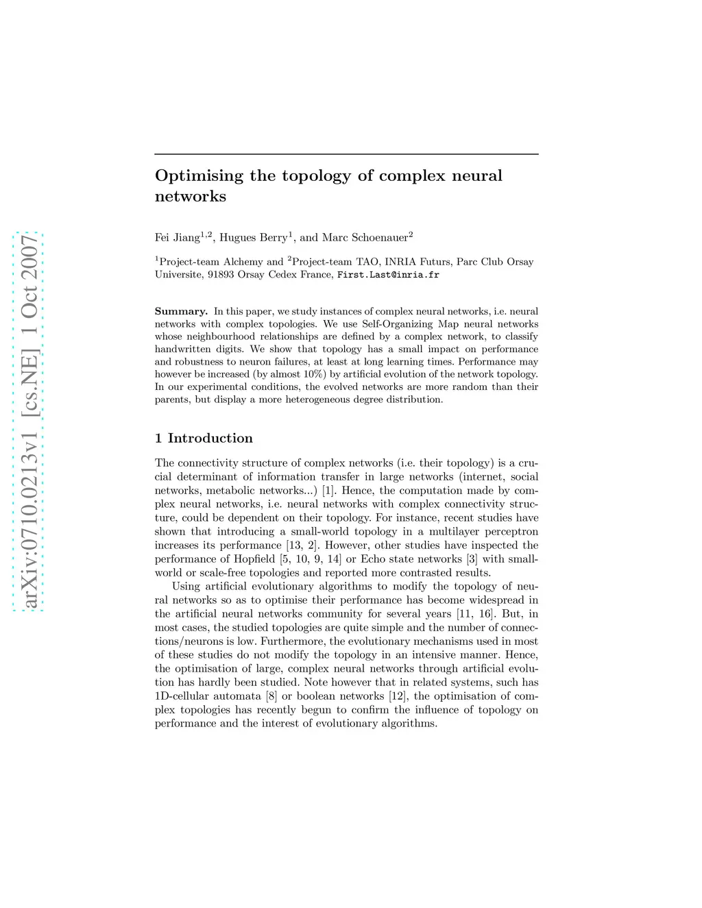 In this paper, we study instances of complex neural networks, i.e. neural netwo rks with complex topologies. We use Self-Organizing Map neural networks whose n eighbourhood relationships are defined by a complex network, to classify handwr itten digits. We show that topology has a small impact on performance and robus tness to neuron failures, at least at long learning times. Performance may howe ver be increased (by almost 10%) by artificial evolution of the network topo logy. In our experimental conditions, the evolved networks are more random than their parents, but display a more heterogeneous degree distribution.
