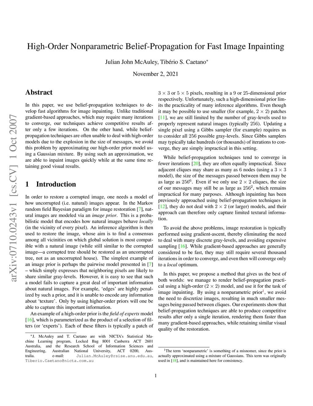 High-Order Nonparametric Belief-Propagation for Fast Image Inpainting