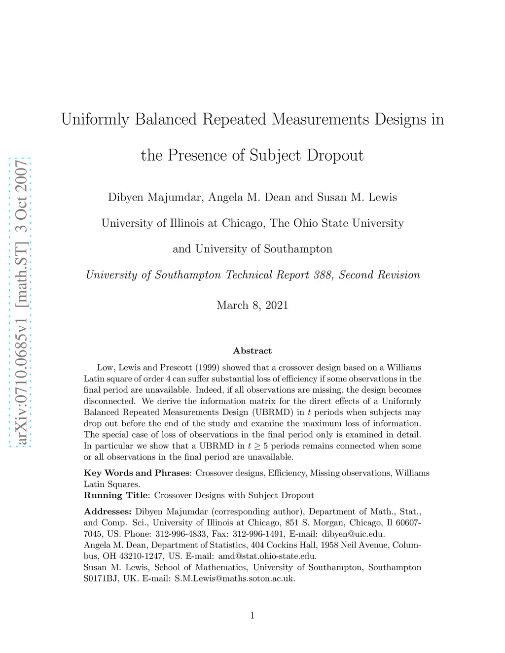 Low, Lewis and Prescott (1999) showed that a crossover design based on a Williams Latin square of order 4 can suffer substantial loss of efficiency if some observations in the final period are unavailable. Indeed, if all observations are missing, the design becomes disconnected. We derive the information matrix for the direct effects of a Uniformly Balanced Repeated Measurements Design (UBRMD) in t periods when subjects may drop out before the end of the study and examine the maximum loss of information. The special case of loss of observations in the final period only is examined in detail. In particular we show that a UBRMD in t>= 5 periods remains connected when some or all observations in the final period are unavailable.