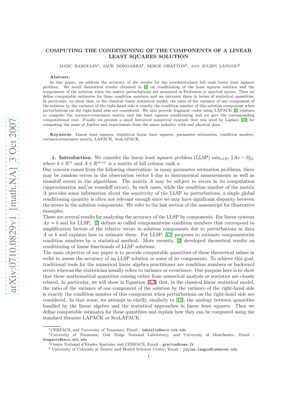 In this paper, we address the accuracy of the results for the overdetermined full rank linear least squares problem. We recall theoretical results obtained in Arioli, Baboulin and Gratton, SIMAX 29(2):413--433, 2007, on conditioning of the least squares solution and the components of the solution when the matrix perturbations are measured in Frobenius or spectral norms. Then we define computable estimates for these condition numbers and we interpret them in terms of statistical quantities. In particular, we show that, in the classical linear statistical model, the ratio of the variance of one component of the solution by the variance of the right-hand side is exactly the condition number of this solution component when perturbations on the right-hand side are considered. We also provide fragment codes using LAPACK routines to compute the variance-covariance matrix and the least squares conditioning and we give the corresponding computational cost. Finally we present a small historical numerical example that was used by Laplace in Theorie Analytique des Probabilites, 1820, for computing the mass of Jupiter and experiments from the space industry with real physical data.