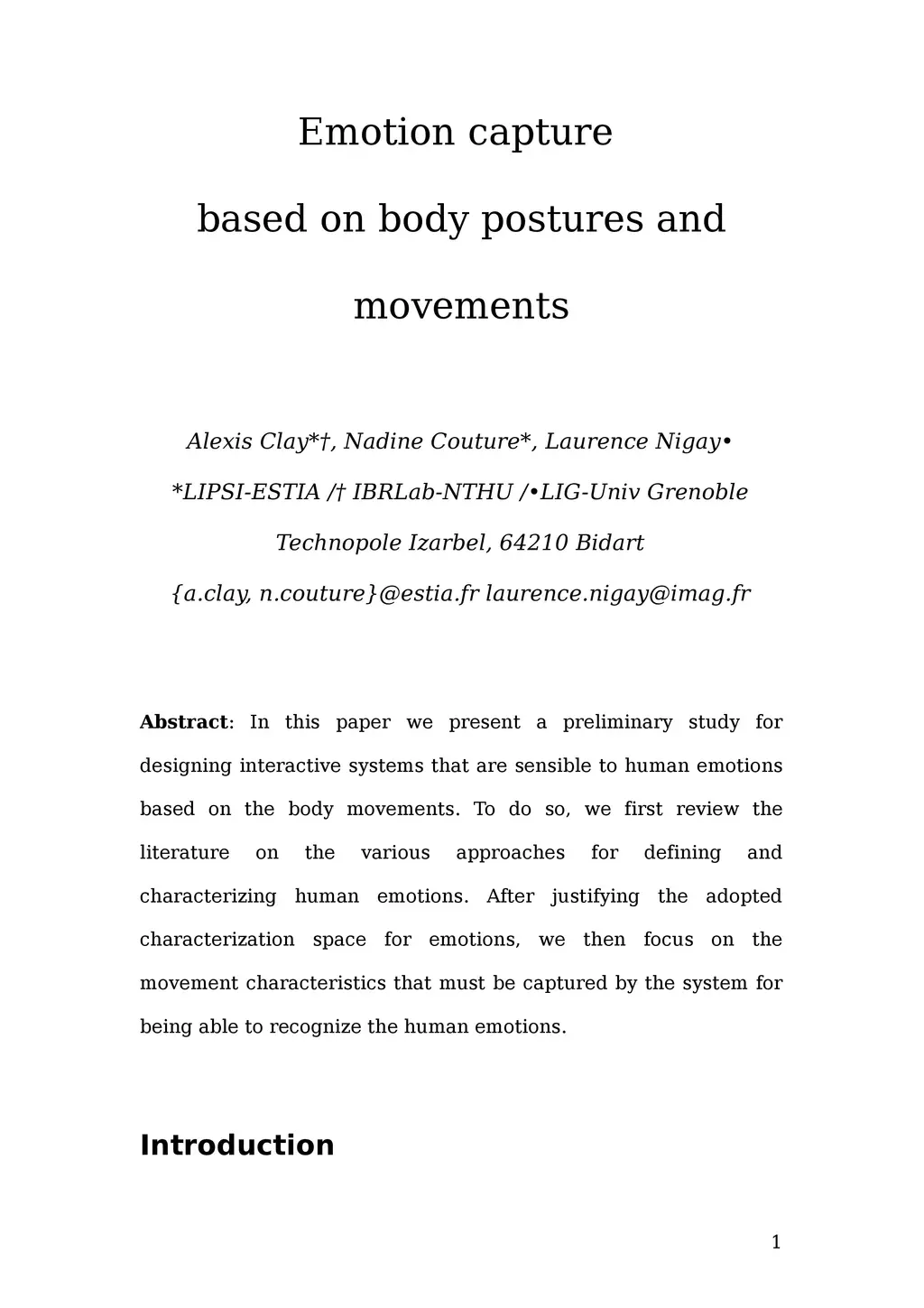 In this paper we present a preliminary study for designing interactive systems that are sensible to human emotions based on the body movements. To do so, we first review the literature on the various approaches for defining and characterizing human emotions. After justifying the adopted characterization space for emotions, we then focus on the movement characteristics that must be captured by the system for being able to recognize the human emotions.