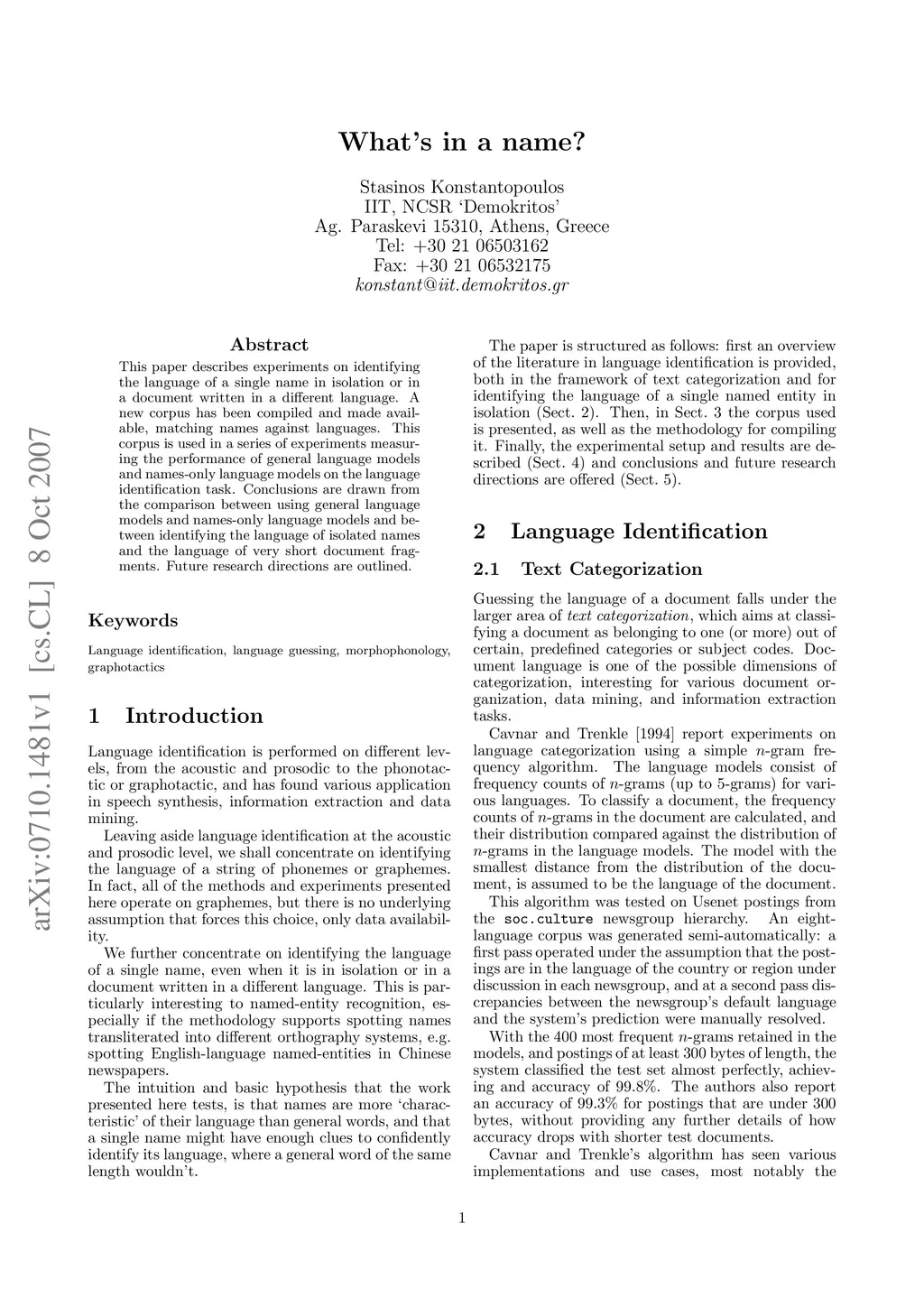 This paper describes experiments on identifying the language of a single name in isolation or in a document written in a different language. A new corpus has been compiled and made available, matching names against languages. This corpus is used in a series of experiments measuring the performance of general language models and names-only language models on the language identification task. Conclusions are drawn from the comparison between using general language models and names-only language models and between identifying the language of isolated names and the language of very short document fragments. Future research directions are outlined.