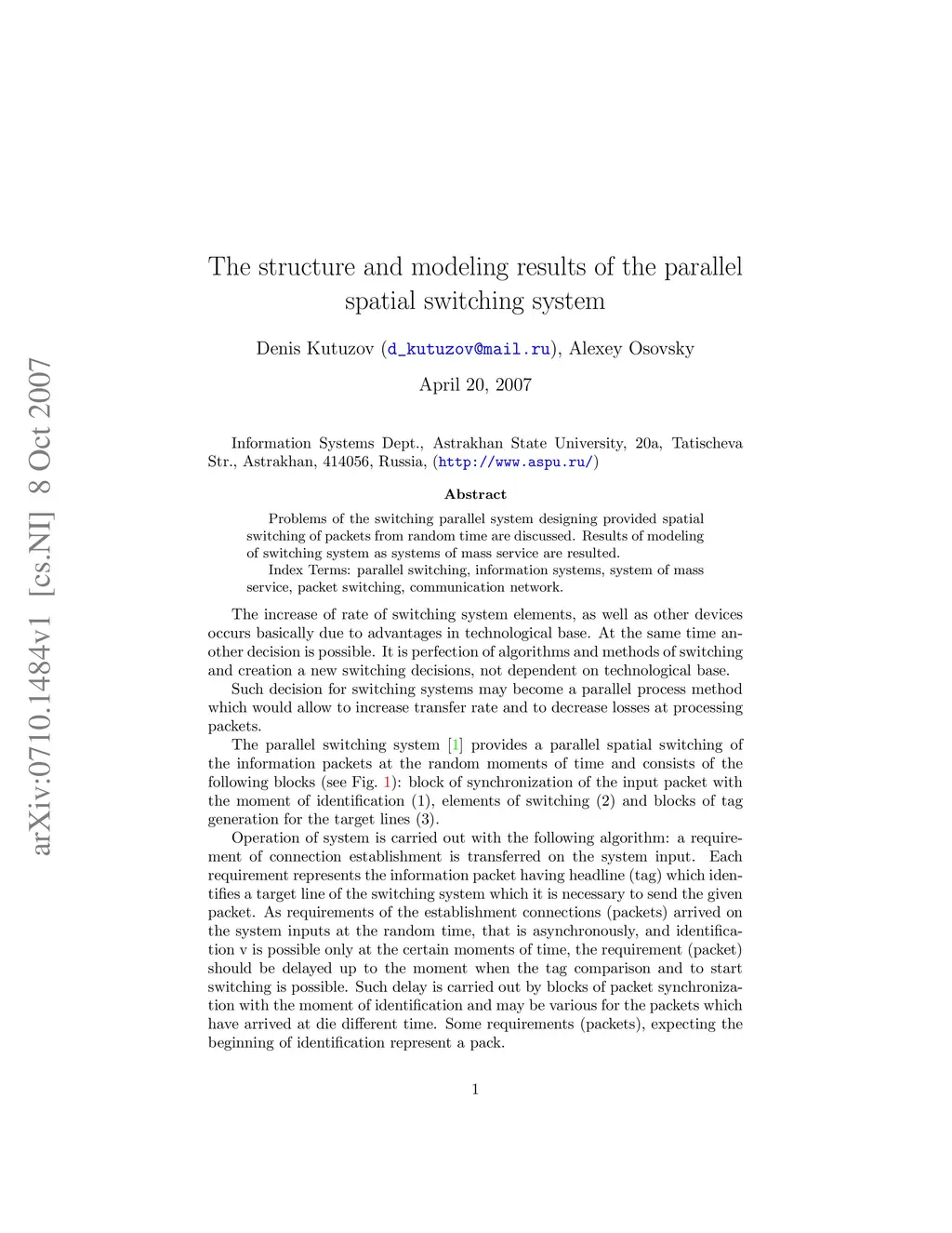 Problems of the switching parallel system designing provided spatial switching of packets from random time are discussed. Results of modeling of switching system as systems of mass service are resulted.