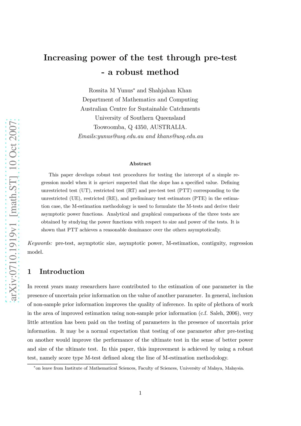 This paper develops robust test procedures for testing the intercept of a simple regression model when it is \textit{apriori} suspected that the slope has a specified value. Defining unrestricted test (UT), restricted test (RT) and pre-test test (PTT) corresponding to the unrestricted (UE), restricted (RE), and preliminary test estimators (PTE) in the estimation case, the M-estimation methodology is used to formulate the M-tests and derive their asymptotic power functions. Analytical and graphical comparisons of the three tests are obtained by studying the power functions with respect to size and power of the tests. It is shown that PTT achieves a reasonable dominance over the others asymptotically.