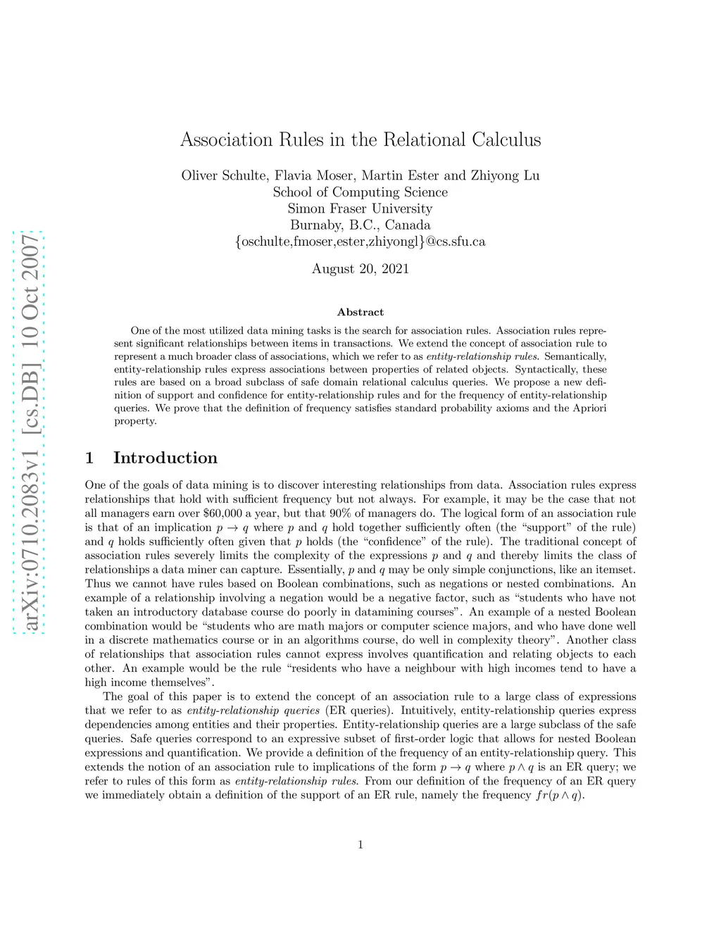 One of the most utilized data mining tasks is the search for association rules. Association rules represent significant relationships between items in transactions. We extend the concept of association rule to represent a much broader class of associations, which we refer to as \emph{entity-relationship rules.} Semantically, entity-relationship rules express associations between properties of related objects. Syntactically, these rules are based on a broad subclass of safe domain relational calculus queries. We propose a new definition of support and confidence for entity-relationship rules and for the frequency of entity-relationship queries. We prove that the definition of frequency satisfies standard probability axioms and the Apriori property.