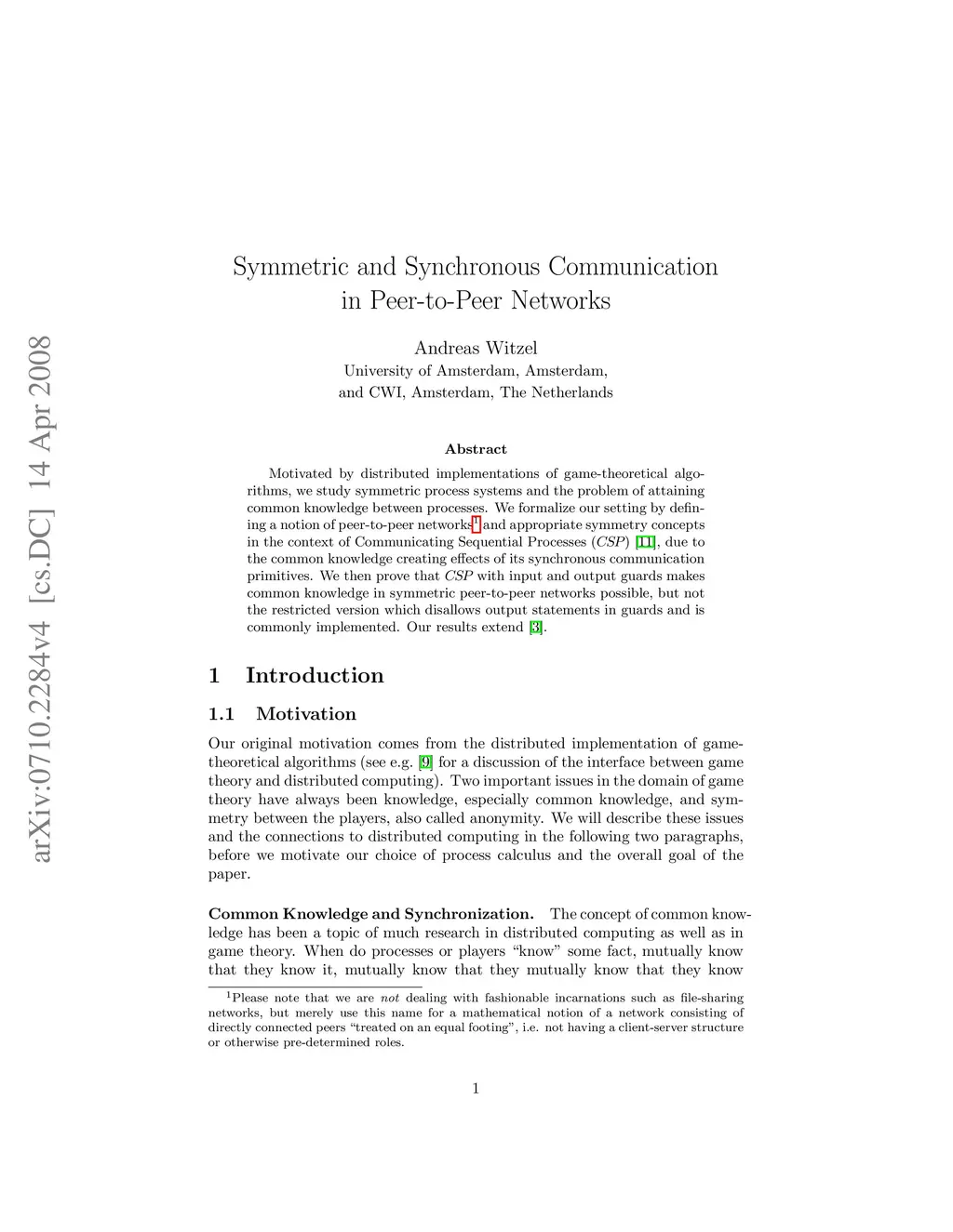 Motivated by distributed implementations of game-theoretical algorithms, we study symmetric process systems and the problem of attaining common knowledge between processes. We formalize our setting by defining a notion of peer-to-peer networks(*) and appropriate symmetry concepts in the context of Communicating Sequential Processes (CSP), due to the common knowledge creating effects of its synchronous communication primitives. We then prove that CSP with input and output guards makes common knowledge in symmetric peer-to-peer networks possible, but not the restricted version which disallows output statements in guards and is commonly implemented. (*) Please note that we are not dealing with fashionable incarnations such as file-sharing networks, but merely use this name for a mathematical notion of a network consisting of directly connected peers "treated on an equal footing", i.e. not having a client-server structure or otherwise pre-determined roles.)