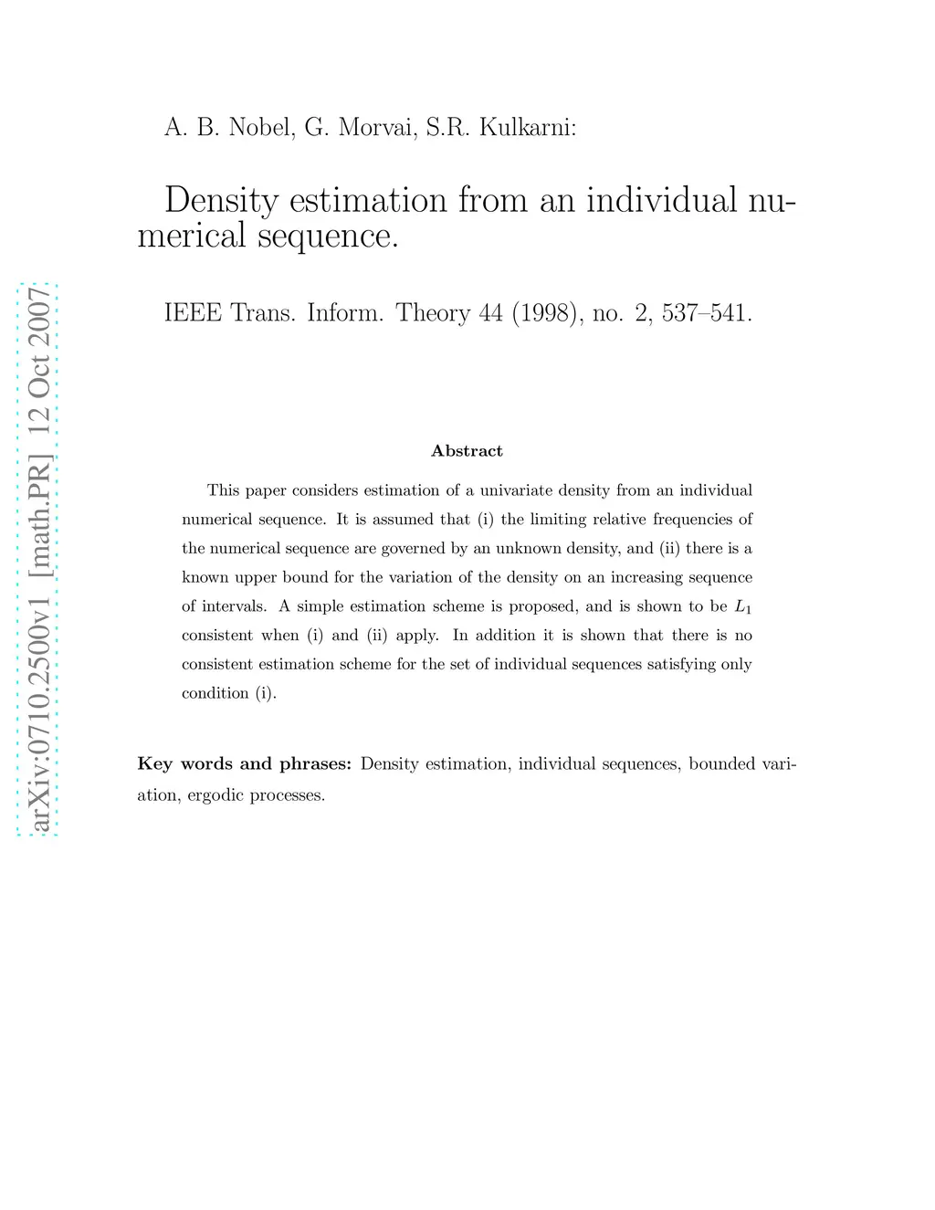 This paper considers estimation of a univariate density from an individual numerical sequence. It is assumed that (i) the limiting relative frequencies of the numerical sequence are governed by an unknown density, and (ii) there is a known upper bound for the variation of the density on an increasing sequence of intervals. A simple estimation scheme is proposed, and is shown to be consistent when (i) and (ii) apply. In addition it is shown that there is no consistent estimation scheme for the set of individual sequences satisfying only condition (i).