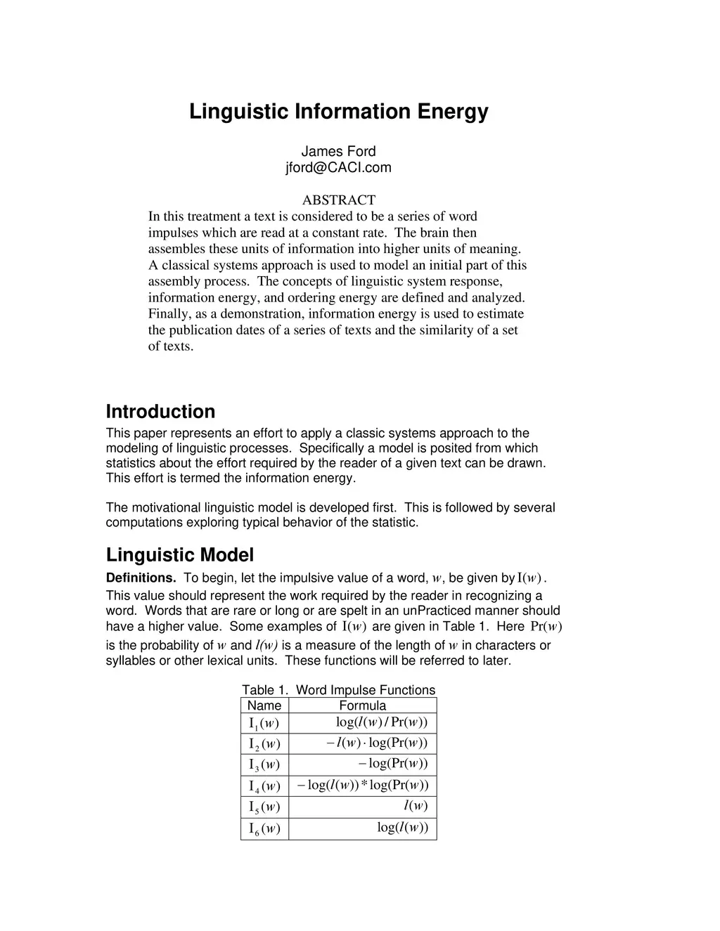 In this treatment a text is considered to be a series of word impulses which are read at a constant rate. The brain then assembles these units of information into higher units of meaning. A classical systems approach is used to model an initial part of this assembly process. The concepts of linguistic system response, information energy, and ordering energy are defined and analyzed. Finally, as a demonstration, information energy is used to estimate the publication dates of a series of texts and the similarity of a set of texts.
