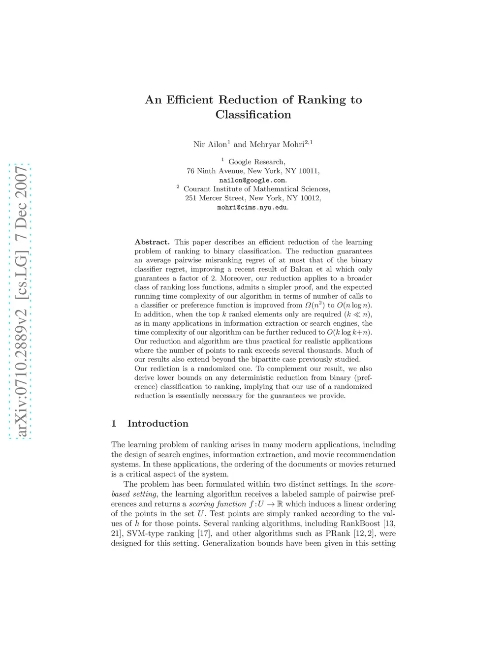 This paper describes an efficient reduction of the learning problem of ranking to binary classification. The reduction guarantees an average pairwise misranking regret of at most that of the binary classifier regret, improving a recent result of Balcan et al which only guarantees a factor of 2. Moreover, our reduction applies to a broader class of ranking loss functions, admits a simpler proof, and the expected running time complexity of our algorithm in terms of number of calls to a classifier or preference function is improved from to . In addition, when the top ranked elements only are required (), as in many applications in information extraction or search engines, the time complexity of our algorithm can be further reduced to . Our reduction and algorithm are thus practical for realistic applications where the number of points to rank exceeds several thousands. Much of our results also extend beyond the bipartite case previously studied. Our rediction is a randomized one. To complement our result, we also derive lower bounds on any deterministic reduction from binary (preference) classification to ranking, implying that our use of a randomized reduction is essentially necessary for the guarantees we provide.